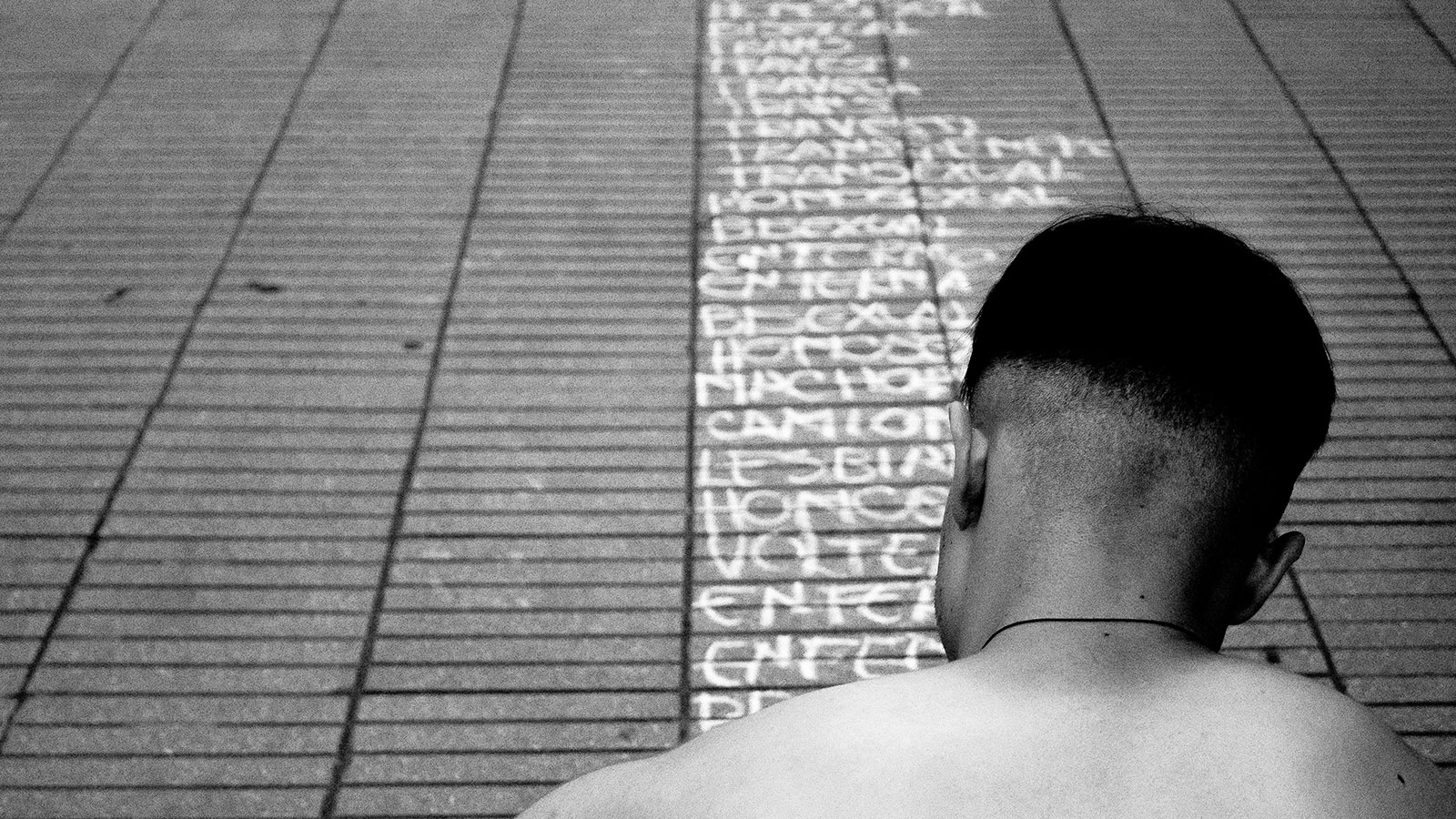 En esta presenta su cuerpo semidesnudo ante los transeúntes para escribir con tiza una serie de palabras y categorías denigrantes que se le han asignado a la población diversa para nombrarla e invisibilizarla; voltiado, marica, loca, machorra, desviado, son algunas de las palabras que encabezan la larga lista.