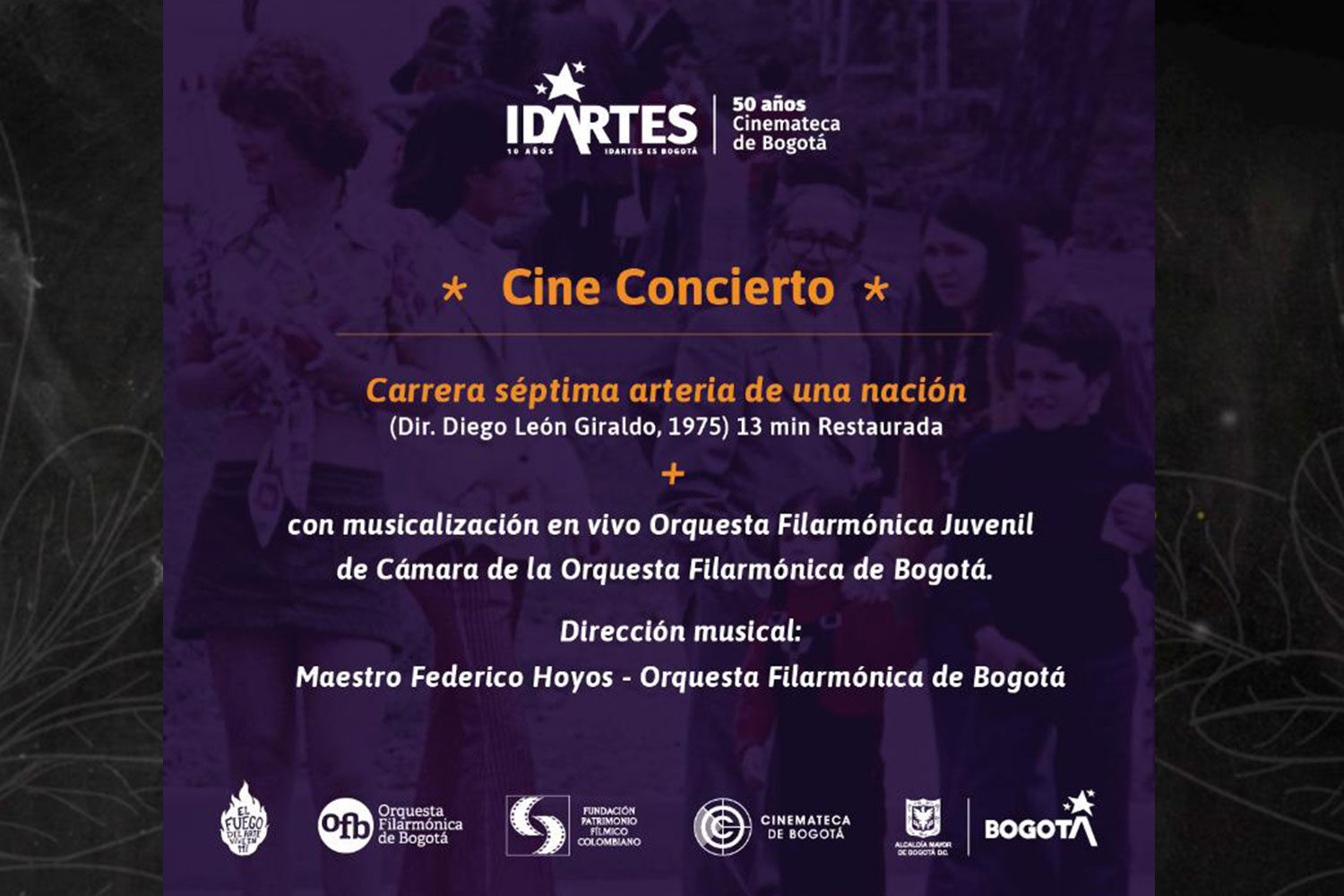 En la marco de la celebración de los 50 años de la Cinemateca Distrital, se realizó una función de cine concierto del cortometraje “Carrera séptima arteria de una nación” de Diego León Giraldo, 1975 musicalizada en vivo por la Orquesta Juvenil de Cámara de la Filarmónica de Bogotá con la dirección del Maestro Federico Hoyos y a partir de la composición musical de MUSICINE, María Linares, Oscar Olaya y Samuel Lizarralde. Este cortometraje hace parte de la colección Fílmica Nacional de la Cinemateca, restaurada digitalmente en el 2016. Sobre la pieza podemos decir que se trata de una radiografía de la época, la estética enmarcada en los años setenta le dan ese ambiente sórdido, convulso y multifacético que a lo largo de la historia ha caracterizado a la emblemática Carrera Séptima, como una pasarela de hechos históricos, eventos políticos y de tránsito constante de todo tipo personajes que recorren la ciudad.  Cabe destacar el trabajo impecable de la composición musical creada para este cine concierto y la extraordinaria ejecución de la Orquesta Juvenil de Cámara, pues potencia la construcción poética de las imágenes y nos sumerge en la atmósfera de la época y de las situaciones efímeras que logró captar con su mirada Diego León Giraldo a través de este film.
